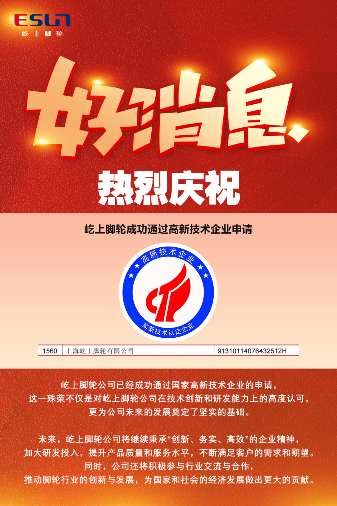 我们自豪地宣布——上海屹上脚轮有限公司正式迈入高新技术企业行列!