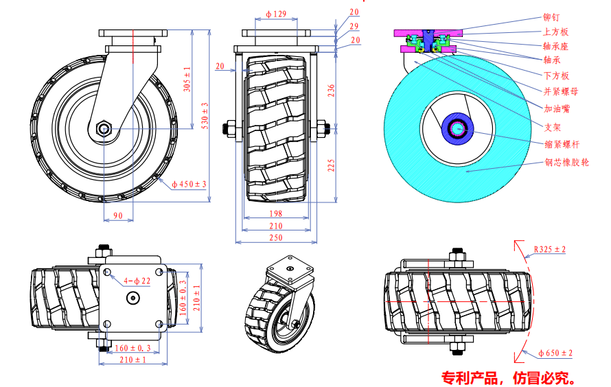 产品货号: JQR010310-450CNR112 70A产品尺寸: 450×191mm 载重:2500KG胎面材质:橡胶胎面硬度:70 ShoreA ±3