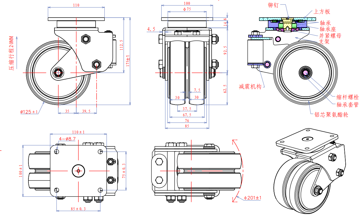 头部轴承结构,双弹簧减震,铝合金轮芯聚氨酯轮面,带防尘盖;