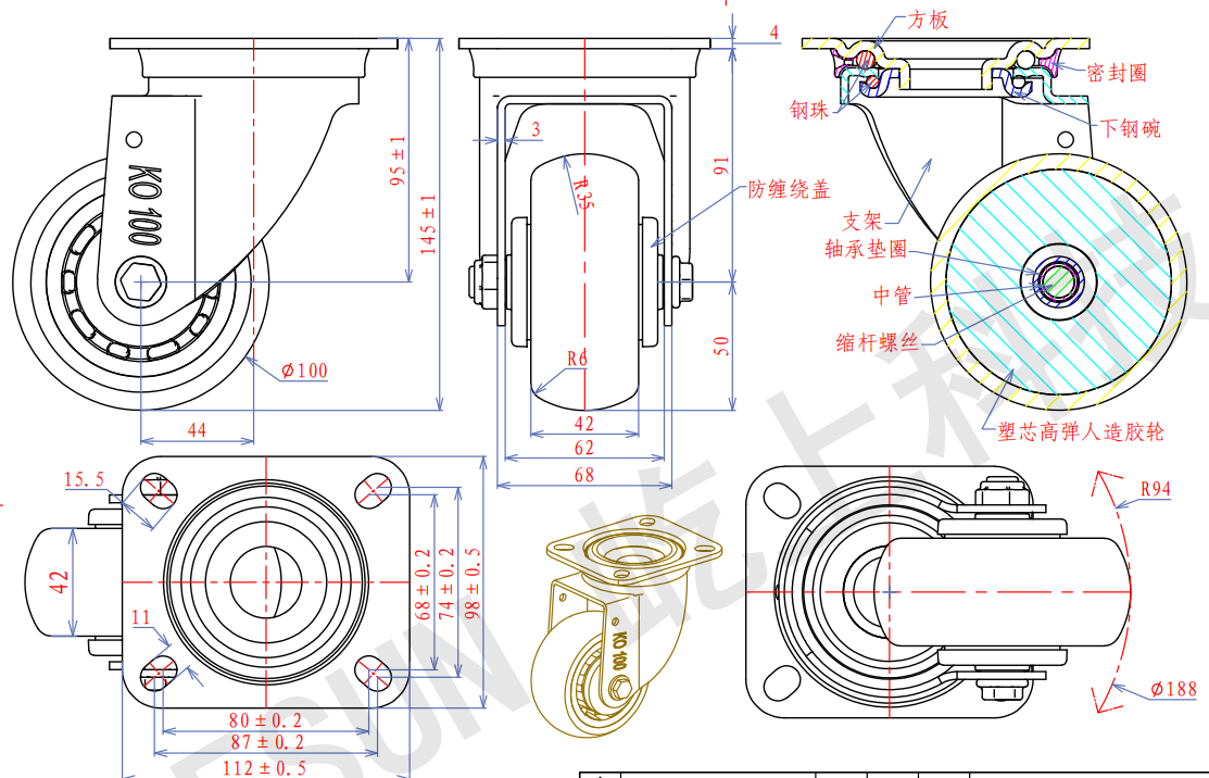 支架采用抗冲击设计制造,钢压制成型,并通过对球轨道进行冷作硬化而达到长使用寿命。表面镀锌处理,蓝色钝化,不含六价铬。轮片采用高强度PP+优质TPR注塑粘合而成,具有高弹力、抗切割、减震、环保、保护地面无轮印的特点。