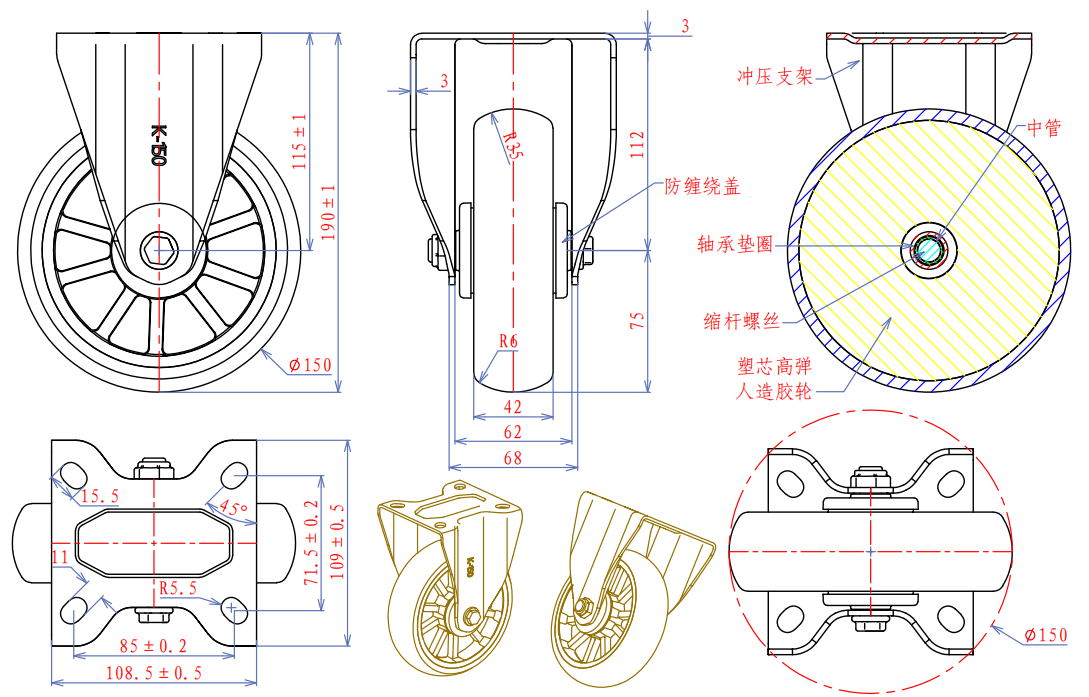 支架采用抗冲击设计制造,钢压制成型,并通过对球轨道进行冷作硬化而达到长使用寿命。表面镀锌处理,蓝色钝化,不含六价铬。轮片采用高强度PP+优质TPR注塑粘合而成,具有高弹力、抗切割、减震、环保、保护地面无轮印的特点。
