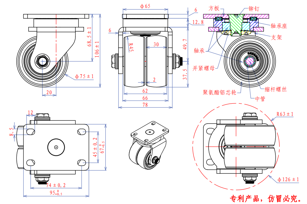 产品货号: DZ06210-75ALCPU122 95A产品尺寸: 70×30*2mm 载重:350KG胎面材质:铝芯聚氨酯胎面硬度:95A