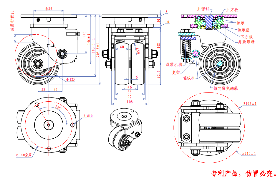 轮片采用双轮片铝芯浇注PU,轻便、静音,适用于高速运转的使用环境,常用于搬运AGV机器人行业。