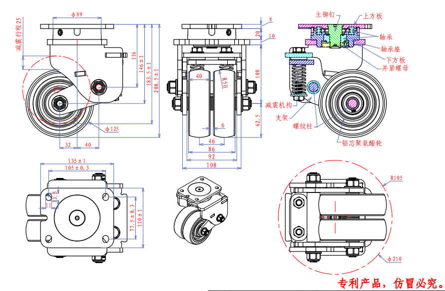 轮片采用双轮片铝芯浇注PU,轻便、静音,适用于高速运转的使用环境,常用于搬运AGV机器人行业。